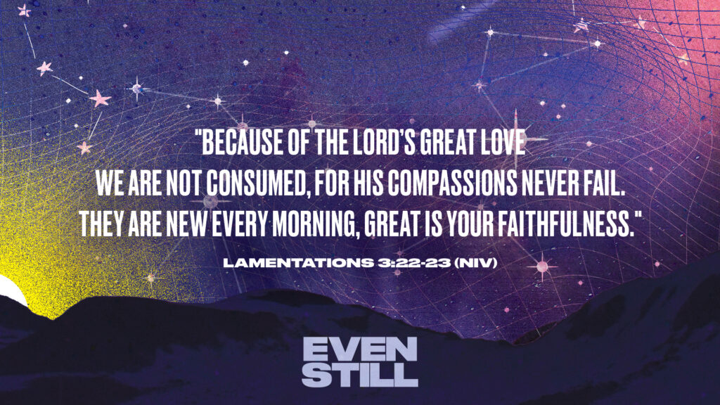 SERIES OVERVIEW: When life feels dark—like nothing is going right and nothing ever will—it’s easy to feel lost and hopeless. But just like the sun, moon, and stars light up the darkest sky, God’s light shines in our lives even in the hardest moments because God’s presence carries us, no matter what we face. In this 4-week series from Jeremiah and Lamentations, we’ll explore how God meets us in our pain and brings light to guide us through. We’ll learn that, even still, God’s promises are true, God is good, God is with us, and God gives us hope.